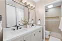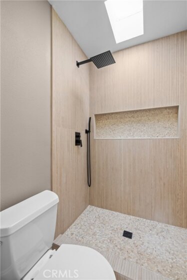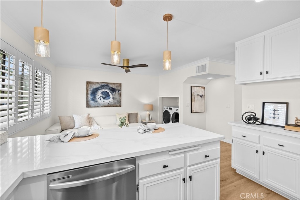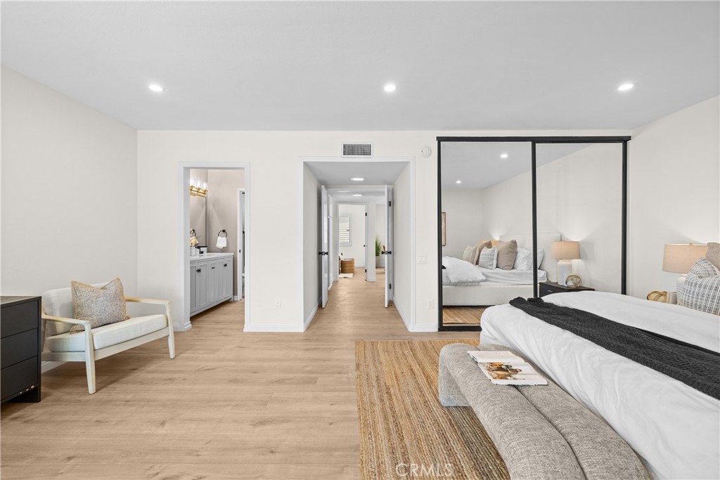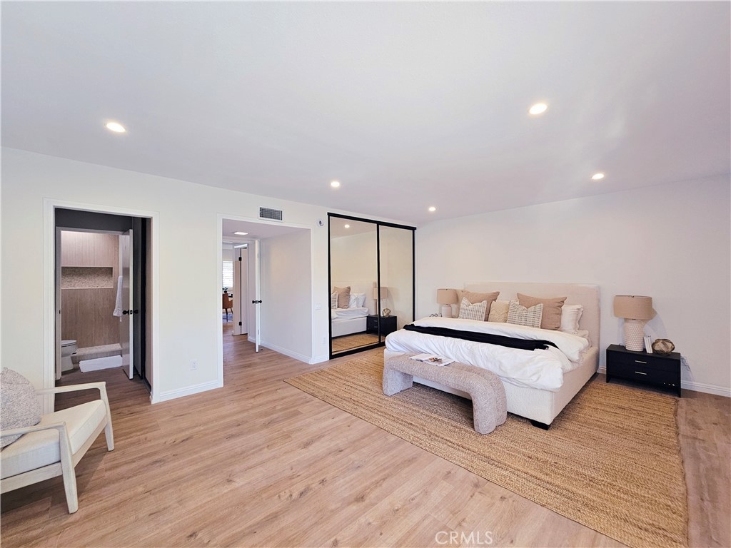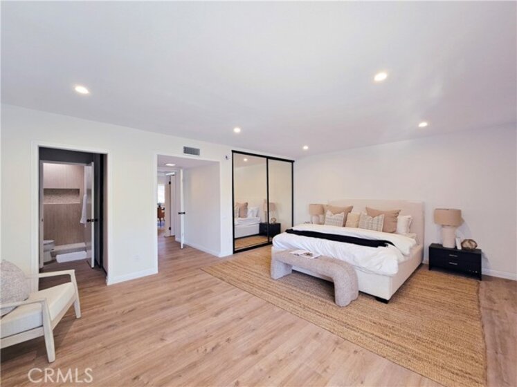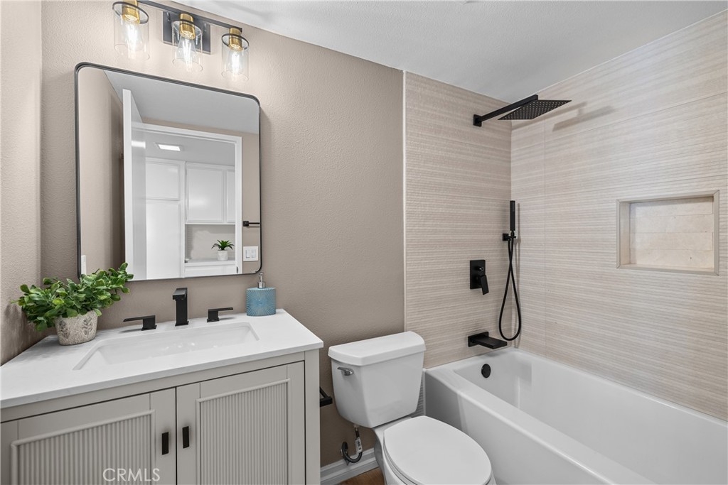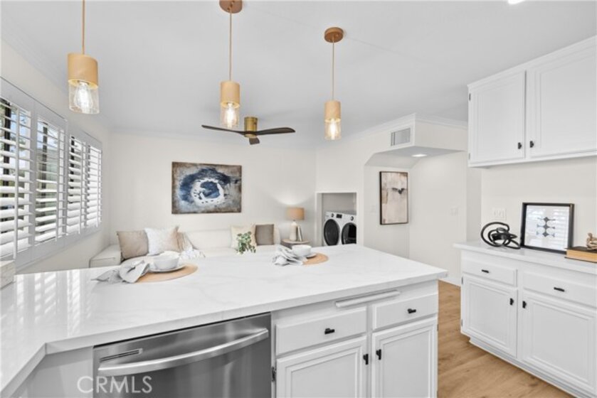 Gorgeous, remodeled townhome in the serene Dove Creek community, offering over 1,750 square feet of living space with 3 bedrooms and 2.5 bathrooms. A grand double-door entry opens to a spacious living room with soaring two-story ceilings, a cozy fireplace, and plantation shutters. Sliding glass doors fill the space with natural light and lead to a private patio—perfect for morning coffee or evening relaxation. An elevated dining area overlooks the living room and flows seamlessly into the kitchen and family room, creating an ideal layout for both everyday living and entertaining. The light-filled kitchen features quartz countertops, stylish pendant lighting, and stainless steel appliances, including a newer stove and microwave. Adjacent, the family room offers a comfortable space to gather or unwind. Upstairs, a versatile loft with accordion doors provides the perfect option for a home office or third bedroom. The oversized primary suite boasts double-door entry, high ceilings, beautiful flooring, dual closets, and a private en-suite bath. The primary bathroom has been thoughtfully updated with a dual-sink vanity, modern lighting, updated mirrors, and a beautifully remodeled walk-in shower. Additional highlights include a tastefully remodeled powder room for guests and an updated hall bathroom with contemporary finishes. The secondary bedroom features a clean, neutral aesthetic. Private Double Car Garage with Automatic Opener and Direct Access. Central Air & Heat. Residents of Dove Creek enjoy access to a pool, two spas, and a tennis court. Ideally located near shopping, dining, and entertainment at The Village, Westfield Topanga, and Ventura Boulevard, with convenient access to the 101 and 118 freeways.